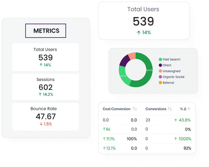 Our Google Analytics Reporting Tool is just one component of a powerful suite that's meant to enable data-driven marketing teams and agencies. With an easy-to-use interface, automatic updates, and customisable reporting, it's designed to scale with your objectives. Unlike cluttered dashboards or overly complicated software, our Google Analytics report generator provides live clarity with no clutter. All your most important metrics are gathered, sorted, and visualized with no learning curve.